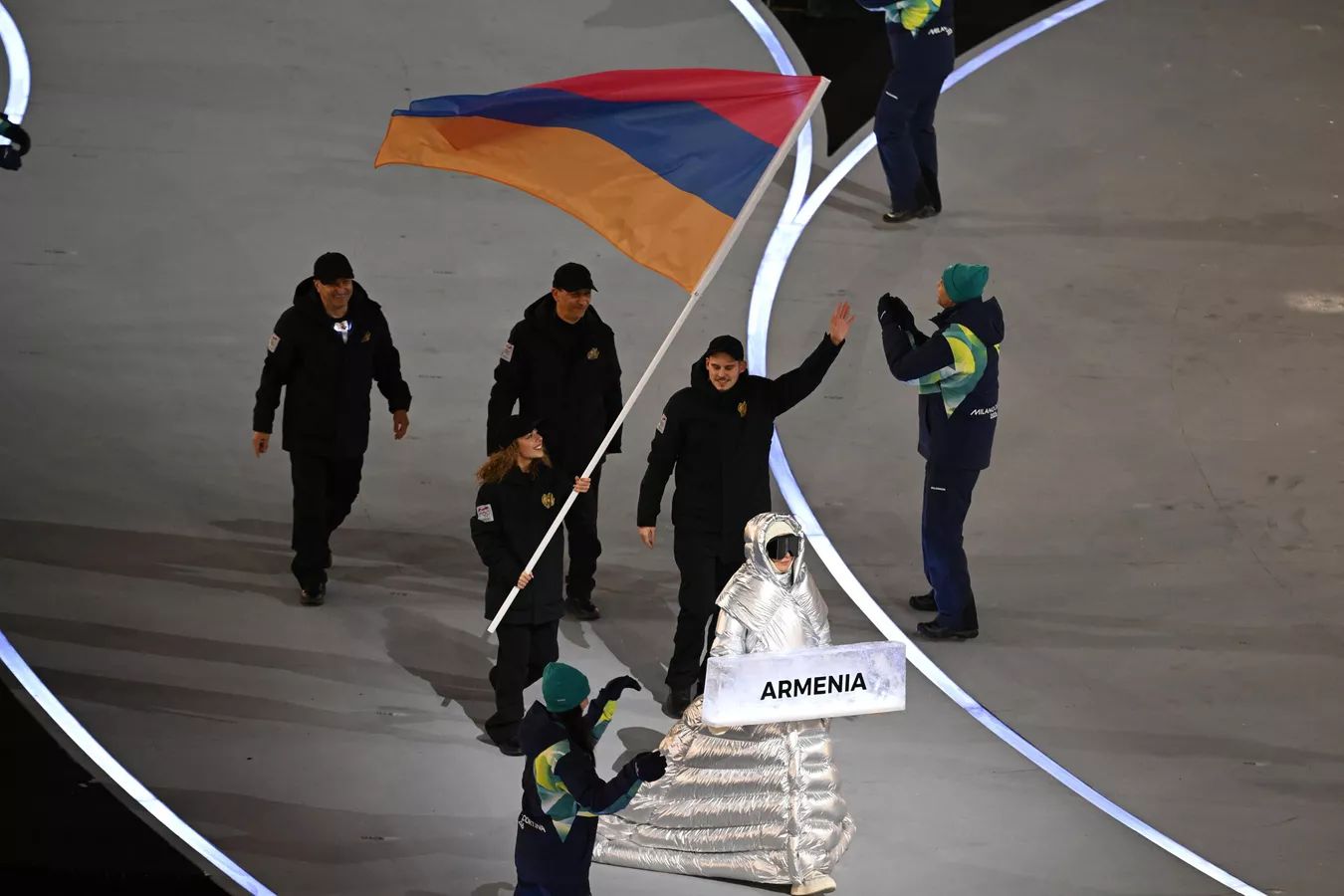 Затем на сцену вышли призеры Игр-2026 из Италии, которые исполнили гимн своей страны. Был поднят национальный флаг, после чего состоялся парад спортсменов – в более сжатом формате, чем две недели назад. Сначала появились знаменосцы каждой из стран-участниц, а вслед за флагами на арену вошла большая группа из спортсменов.