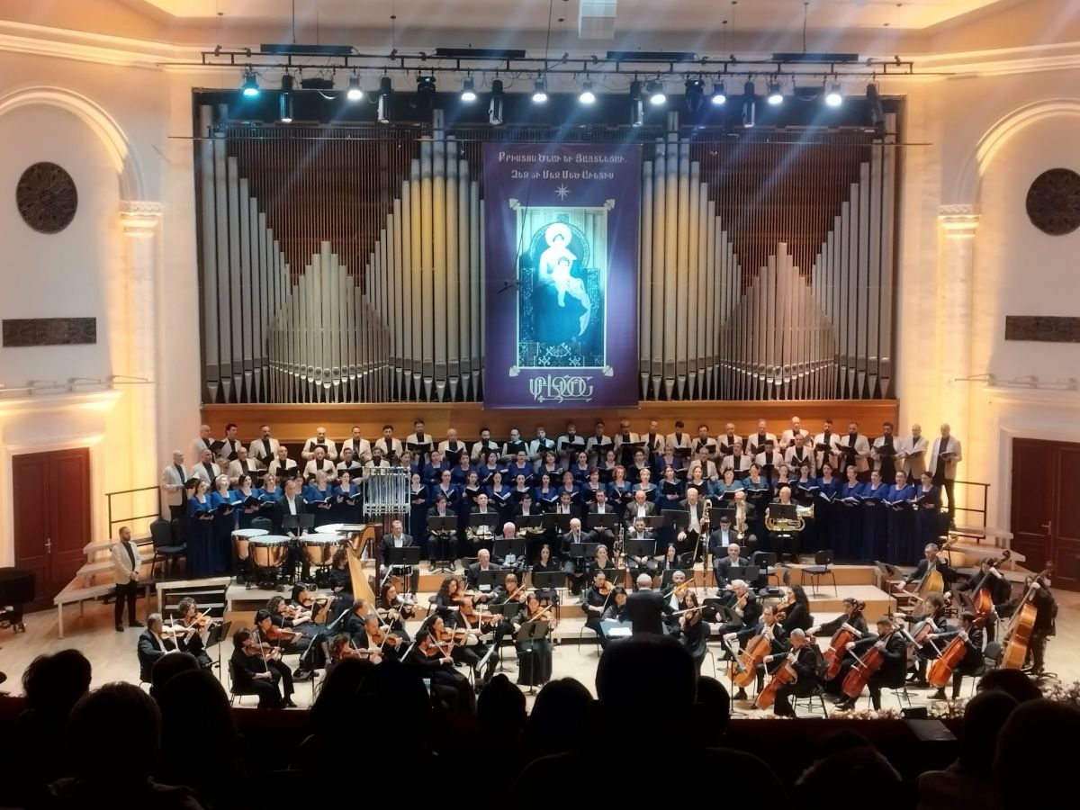 МУЗЫКАЛЬНЫЙ ПРОЕКТ «АРМЯНСКОЕ СВЯТОЕ РОЖДЕСТВО» ДАВНО СТАЛ ДОБРОЙ ТРАДИЦИЕЙ и уже в 5-й раз осуществляется под патронатом и при благословении Католикоса всех армян Гарегина II. В программу были включены как жемчужины армянской духовной музыки, так и известные широкой публике произведения Моцарта, Генделя, Каччини, Дворжака, Гуно, Баха, Римского-Корсакова, Бортнянского и других мировых классиков. В качестве солистов выступили известные оперные певцы — дьякон Ованнес Нерсесян (бас), Сирануш Гаспарян (сопрано), Александра Соколова (сопрано), Полина Шароварова (меццо-сопрано), Арам Хачатурян (баритон). Концерт прошел в исполнении Государственного симфонического оркестра Гюмри (художественный руководитель и главный дирижер Армен Карчян), которым в этот вечер дирижировал заслуженный деятель искусства РА Рубен Асатрян, и Национального академического хора Армении (художественный руководитель и главный дирижер Ованнес Чекиджян). В зале присутствовали представители духовенства, дипломатические лица, деятели культуры Армении и просто ценители классической и духовной музыки.