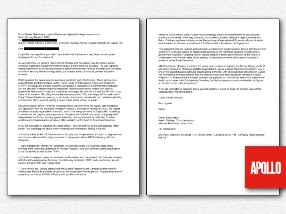 Նշվում է, որ Լոնդոնում տեղակայված «Apollo Strategic Communications» կազմակերպությունը մարտի 2-ին, ամերիկյան ԶԼՄ-ներին ուղարկված նամակով վերջիններիս խմբագիրներին առաջարկել է «ոչ հրապարակային քննարկումներ» սկսել։ Նպատակ է եղել արատավորել Հայ դատի Ամերիկայի հանձնախմբին, արժեզրկել ու վարկաբեկել դրա գործունեությունը։
